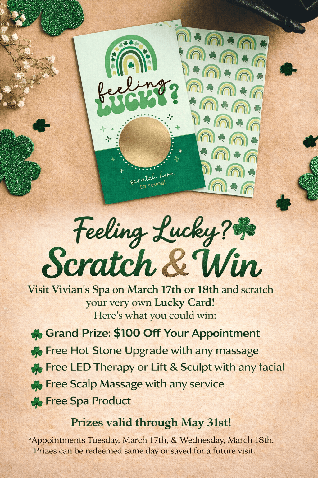 Book any of your favorite services on March 17th or 18th and get the chance to play our St. Patrick’s Day scratch & win game!